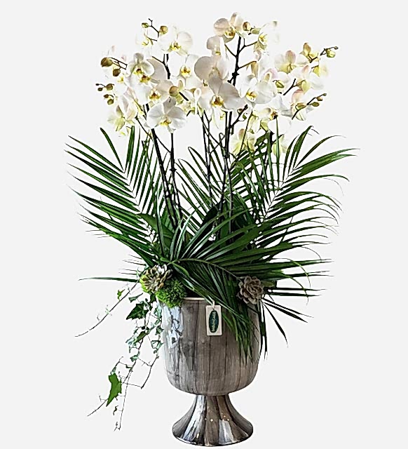 6 daldan oluşan ithal beyaz orkide görselliğiyle göz kamaştırıyor. Üstelik etkileyici bu tasarım gözü oldukça dolduruyor.