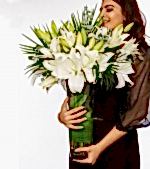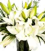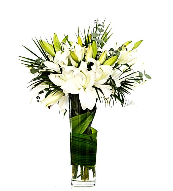 Beyaz Lilyum : 5 Adet Okaliptus yaprağı: 2 Adet Fenix Yapragı: 4 Adet Yaklaşık Ürün Boyutu: 50-60cm Bembeyaz ve çok özel... şefaf cam vazoda yeşilliklerle süslenmiş beyaz lilyumlar ile hazırlanmış Zarif Kuğu çiçek aranjmanı ile sevdiklerinize zarif bir jest yapın.