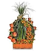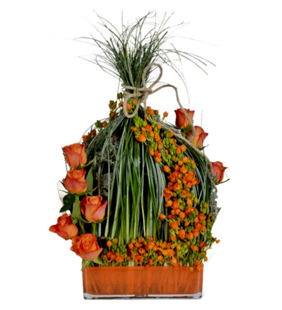 Cam Vazoda Turuncu Güller Turuncu Ornisler Beargrease Yeşillikleri ile VİP Tasarım Aranjman