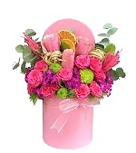 Pembe kutuda pembe gül, pembe çardak gülleri ve mevsim çiçekleri ile hazırlanan pembe kutuda çiçek aranjmanı
