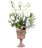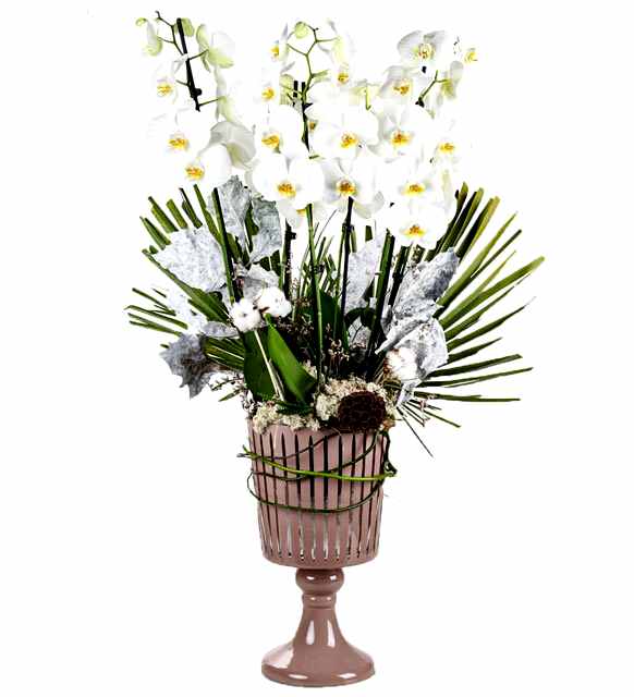 Dekoratif beton saksısında orkide tasarımında kullanılan orkide ithaldir. Yapay ve kuru bitkilerle tasarlanmıştır ağaç yosunu kullanılmıştır. Son derece şık ve keyifli bir üründür.